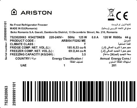 ARBI54 F5282 ME: ثلاجة ومُجَمِّد مُدمَج(ثلاجات سفلية, 54 صم)