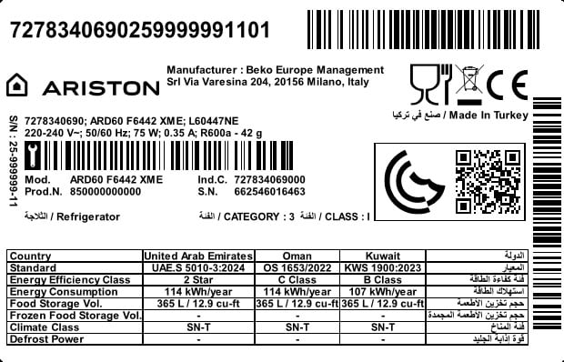 ARD60 F6442 XME: لتر)ثلاجة (ثلاجة تخزين, 365