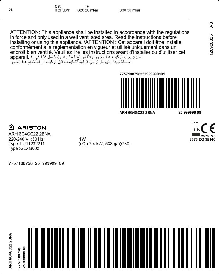 ARH 6G4GC22 2BNA: غاز مُدمَج (غاز, 60 سم)