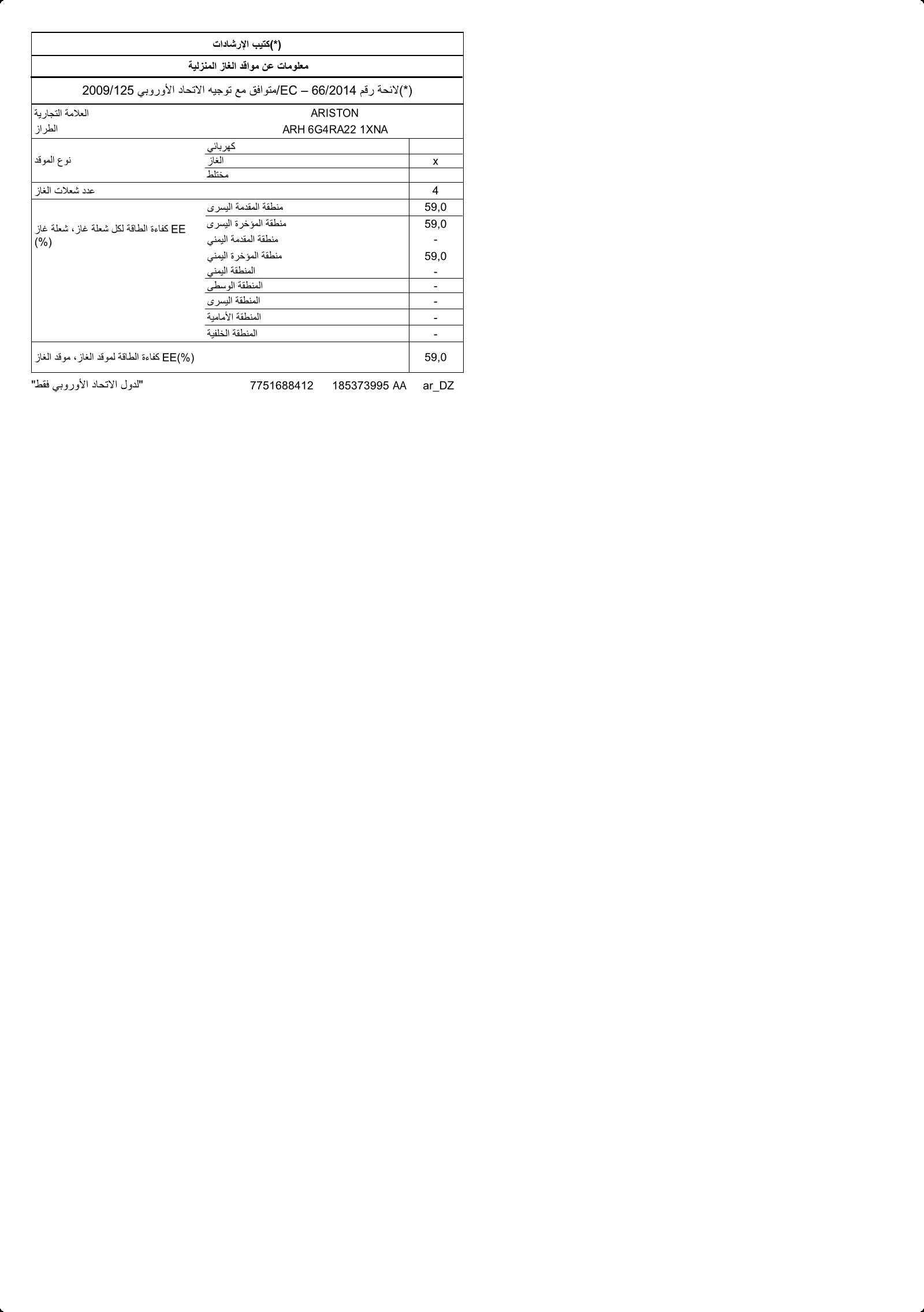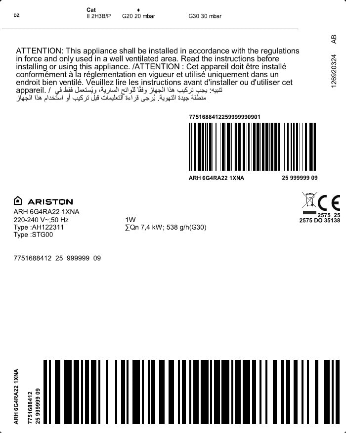 ARH 6G4RA22 1XNA: غاز مُدمَج (غاز, 60 سم)